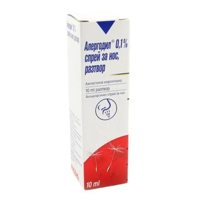 Allergodil спрей e разтвор с противоалергично действие за назално приложение, който съдържа азеластинов хидрохлорид като активно вещество и се прилага за симптоматично лечение на несезонен (целогодишен) алергичен ринит или сенна хрема (сезонен алергичен ринит). Предлага се в опаковка от 10 мл.