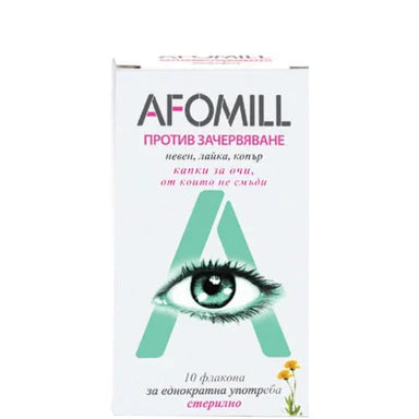 Растителният дестилат за очи Afomill от Велеви Фарма съдържа невен, лайка и копър. Приложим при раздразнени и зачервени очи. Спомага за отстраняване на зачервяването и възстановява бистротата, ако очите са раздразнени от вятър, ултравиолетови лъчи, хлор или грим. Неговите рН, изотоничност и осмоларност са изцяло съвместими с тъканта на очите и слъзния секрет. Синергичното действие на съставките оказва успокояващ и отбъбващ ефект в окото и могат да се използват както за успокояване, така и за предпазване от дразнене. Капките имат няколко действия в едно: премахват зачервяването в очите и не допускат повторно раздразнение. Предлага се в опаковка от10 флакона х0.5 мл