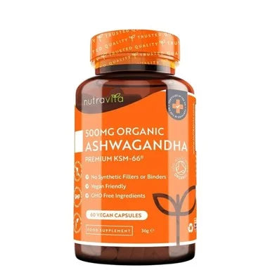 Ashwagandha Organic Premium KSM-66 от Нутравита съдържа органичен екстракт от корен на Ашваганда, който е прецизно стандартизиран до 5% Витанолиди, равняващи на 25 мг във всяка капсула. Ашваганда помага при намаляване на стреса и тревожността, ефективно се използва при справяне с паник атаки и съдейства за подобряване на паметта и когнитивната функция. Подобрява качеството на съня. Предлага се в опаковка от 60 капсули.