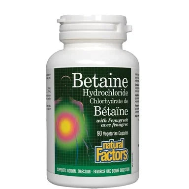 При нарушено храносмилане, Betaine Hydrochloride естествен продукт от Натурал Факторс, който значително подобрява процесите на храносмилане и оказва противодействие при констипация или диария. Спомага за облекчаване на усещането за тежест след хранене. Намалява оригването и гаденето, особено след прием на повече храна. Оптимизира усвояването на хранителни вещества и благоприятства чревната микрофлора. Бетаин хидрохлорид предпазва храносмилателния тракт от бактерии, спомага за разграждането на протеините и мазнините, и допринася за детоксикацията на тялото. Добива се от цвекло и играе ролята на естествена стомашна киселина. Може да се прилага при дефицит на солна киселина в стомашния сок. Доставя на организма хидрохлорна киселина – естествена стомашна киселина, която поддържа нормалното състояние на стомаха. По-възрастните хора (над 60-годишна възраст), имат завишена нужда от допълнителен прием на бетаин хидрохлорид. Не съдържа: изкуствени консерванти; оцветители и подсладители; царевица; млечни продукти; нишесте; пшеница или мая. Предлага се в опаковка от 90 капсули.