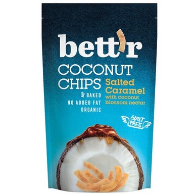 Овкусен със соленост и нектар от кокос, био кокосовият чипс със солен карамел на Bett’r, балансира приятният вкус и състав за да бъде едновременно неустоимо вкусен и полезен. Приготвен изпечен без съдържание на добавени мазнини. Предлага се в опаковка от 70 г.