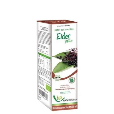 Bio Elder Juice на Абофарма е 100% органичен сок от бъз, произведен от сертифицирано биологично земеделие. Продуктът укрепва имунитета, повишава жизнеността и тонуса, като благоприятно повлиява дефицитни състояния на Витамин C. Оказва силен антиоксидантен ефект. Подходящ за прием при повишен риск от простуда и грип, при психическа и физическа умора, при стресови състояния за организма. С положителен ефект при инфекциите на горните дихателни пътища. Сокът е богат на витамин C, желязо и калий. Предлага се в опаковка от 330 мл.