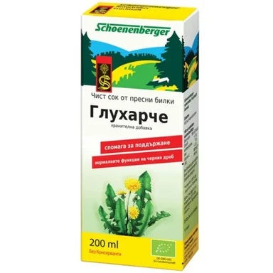 Подходящ за пречистване на организма, сокът от глухарче Шоненбергер, стимулира функциите на жлъчния мехур, храносмилането и повишеното отделяне на жлъчка. Той действа благоприятно за чернодробната функция и пречистването на кръвта. 100% натурален продукт. Не съдържа алкохол или химически консерванти. Предлага се в опаковка от 200 мл.