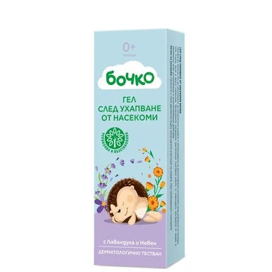 Прозрачният билков гел Bochko облекчава неприятния сърбеж след ухапване от комари, оси, пчели, мухи и други насекоми. Продуктът съдържа екстракт от невен, който притежава силно антимикробно и успокояващо действие, помага за бързото зарастване на рани и предотвратява възпалителните процеси. Включеното натурално лавандулово масло има успокояващ ефект, намалява отока и охлажда кожата. Добавеният екстракт от хамамелис подпомага свиването на кръвоносните съдове, облекчава подутините, а антиоксидантното му действие помага за възстановяването на кожата. Предлага се в опаковка от 20 мл.