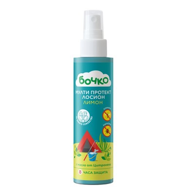Bochko Мулти протект лосион с аромат на лимон е биоциден продукт, който защитава от комари и кърлежи до 8 часа. Съдържащото се масло от Цитронела притежава активно репелентно действие. Подходящ за цялото семейство, за възрастни и деца над 3 години. Предлага се удобна за хващане опаковка от 120 мл със спрей помпа.