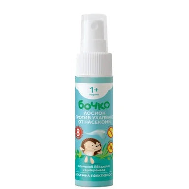 Активната формула на лосионът Bochko държи досадните комари и неприятните кърлежи далеч до 8 часа и е нежен към кожата. Той е биоциден продукт с добавено масло от евкалипт цитронела, което има способността да отблъсква кръвосмучещи насекоми. С едно напръскване ще се радвате на весели игри, спокоен сън и лежерни активности на открито. Предназначен за деца над 1 година. Предлага се в опаковка от 40 мл, подходяща за носене в чанта по време на разходки на открито или вечер навън.