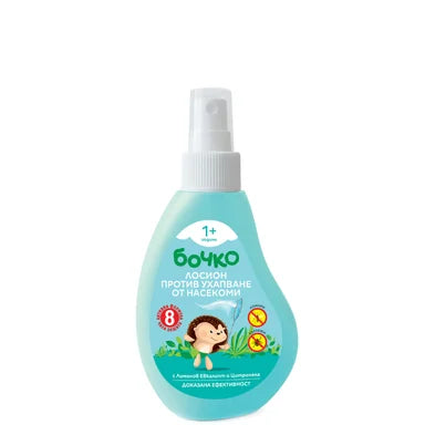 Обогатен с активна формула, лосионът Bochko се грижи да държи неприятните насекоми далеч от кожата до 8* часа. Той е биоциден продукт с добавено масло от евкалипт цитрудора, което е известно със способностите си да отблъсква кръвосмучещи насекоми. Подходящо е за деца над 1 годинка! Предлага се в опаковка от 120 мл.