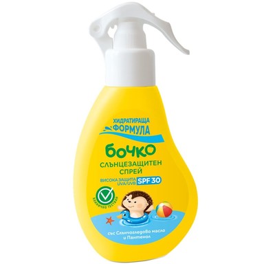 Сега с хидратираща формула, спрят Bochko осигурява висока защита и предпазва детската кожа от изгаряне от вредните за кожата UVA и UVB лъчи. С обновен състав, включващ подбрани слънцезащитни филтри с водоустойчив ефект, подкрепящи кожата компоненти и полезни растителни съставки. Грижовната формула противодейства на факторите, които изсушават кожата благодарение на добавените овлажняващи, успокояващи и подобряващи външния вид на кожата компоненти, витамини и растителни екстракти. Супер лесна и удобна за употреба опаковка с тригър помпа за равномерно разпръскване. Прозрачна формула без нужда от размазване. Предлага се в опаковка от 150 мл.
