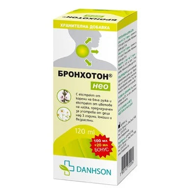 Bronhoton Neo на Дансон e комбиниран продукт от растителни екстракти, който оказва благоприятно въздействие върху гърлото и дихателните пътища. Той спомага за преодоляване на дразнещите усещания и сухотата в гърлото. Успокоява сухата кашлица и възпалените мембрани в устата и гърлото при поглъщане. Индуцира фагоцитоза (процес, при който определени клетки на имунната система поглъщат бактерии, мъртви клетки, тъкани или други твърди частици) и подпомага естествените защитни механизми. Намалява възпалението, свързано с астмата и съдейства за възвръщане на естественото състояние на дихателните пътища. Предлага се в опаковка от 120 мл.