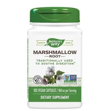 Marshmallow root на Нейчърс Уей с екстракт от бяла ружа е ефективно природно средство при възпалителни процеси в лигавиците на дихателната и храносмилателната системи – бронхити, фарингити, синуити, стомашни язви, диария, констипация, както и състояния, предизвикани от болезнени и възпалени лигавици в организма. Продуктът е подходящ при раздразнена дихателна лигавица, податлива на заразяване с бактерии, вируси и гъбички, профилактика при респираторни заболявания, възпалено гърло и възпаления на горните дихателни пътища, възпаление на оралната и фарингеалната лигавици, и свързаната с това суха кашлица, бронхитите, свързани с продуктивна кашлица (като допълващо задължителното лечение средство), като емолиентно и експекторантно средство за пушачите и лицата, живеещи и работещи в запрашена среда, стомашни болки, причинени от нарушено храносмилане и нараняване на лигавицата, гастрит, ентерит, гастроентерит, стомашна и дуоденална язва, възпаление на урогениталния тракт – цистити, пиелонефрити, нефролитиаза. Предлага се в опаковка от 100 капсули.