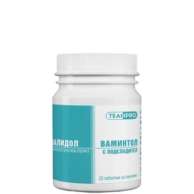 Ваминтол от Тийм Про е нова, оптимизирана форма на Валидола. Той се асимилира изцяло от организма и е подходящ за диабетици. Не съдържа захар и не оказва влияние върху нивата на кръвната захар. Оказва благоприятно въздействие при стрес, проблеми със съня, сърцебиене, други неразположения на нервната и сърдечно-съдова системи. Таблетките са лесни за употреба и имат приятен вкус. Предлага се в опаковка от 20 таблетки.