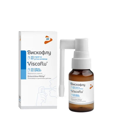 Viscoflu oral е медицинско изделие под формата на орален спрей, приложим при деца над 3 години и възрастни за профилактика при възпалителни процеси на гърлото и лигавицата на устата. Съдържа Ectociclina PROg смес от прополис, екстракт от грейпфрут и ектоин, които действат синергично. Смолистата фракция от прополиса образува защитна бариера върху възпалената лигавица. Биофлавоноидите от грейпфрута имат антиоксидантно действие, противодействат на възпалението и предпазват дихателните пътища от патогените. Ектоинът е органично вещество, което свързвайки се с молекулите на водата има овлажняващо и омекчаващо действие. Не съдържа глутен. Прочетете указанията за употреба на производителя. Предлага се в опаковка от 20 мл.