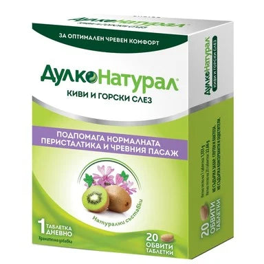 Предагащ натурално облекчение при запек, без привикване, ДулкоНатурал се грижи за комфорта и здравето на храносмилателната система. Съдържа специфична комбинация от изцяло натурални екстракти от плод киви и билката горски слез със синергично действие за оптимален чревен комфорт, нормална перисталтика и чревен пасаж. Не води до привикване и не причинява болка при изхождане. Подходящ за пациенти с хемороиди. Без захар, глутен, консерванти и оцветители. Предлага се в опаковка от 20 таблетки.