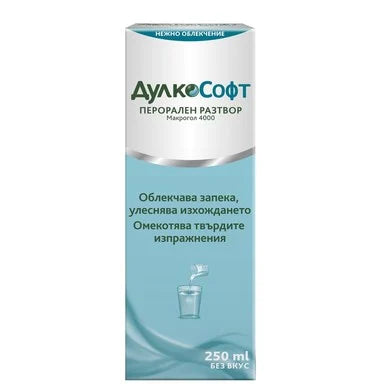 ДулкоСофт е медицинско изделие без лекарско предписание под формата на сироп, коeто облекчава състоянието при запек. Активната съставка в сиропа е макрогол 4000 (PEG 4000), която забавя абсорбцията на вода в червата, омекотява изпражненията и увеличава техния обем. ДулкоСофт действа по изцяло физиологичен начин. Той намалява продължителността на преминаване на храната през дебелото черво и улеснява дефекацията, осигурявайки лесно и безболезнено изхождане. Пероралният разтвор проявява своето действие между 24 и 72 часа след приема. DulcoSoft може да се приема както от възрастни, така и от деца над 2-годишна възраст. Подходящ е за бременни, кърмачки, както и диабетици. Сиропът е без вкус и цвят. Не съдържа глутен. Предлага се в опаковка от 250 мл.
