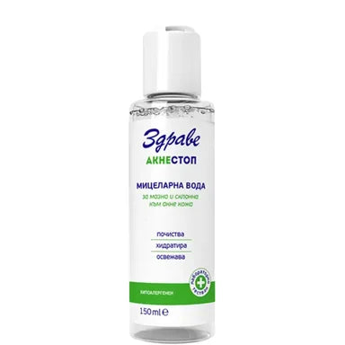 Мицеларната вода Zdrave AcneStop е предназначена за ежедневно почистване на чувствителна, мазна, склонна към акне и бактериални инфекции кожа. Тя възпрепятства прекомерната себумна секреция като по този начин осигурява нормално функциониране на мастните жлези и предпазва от възпаления. Водата лесно отстранява грима, нежно почиства себума, освежава и успокоява кожата. Предлага се в опаковка от 150 мл.