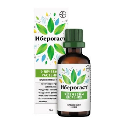 Iberogast от Байер е растителен продукт, под формата на капки, който е предназначен за лечение на функционални и свързани с мотилитета стомашно-чревни заболявания. Той е подходящ за употреба при синдром на нервния стомах и раздразнено дебело черво, включително смущения, наподобяващи спазми на стомашно-чревния тракт (стомашно-чревни спазми), както и за поддържащо лечение на оплакванията при възпаление на стомашната лигавица (гастрит). Иберогаст бързо и ефективно облекчава различни стомашно-чревни оплаквания като болки в стомаха, коремни спазми, газове, подуване на корема, киселини и гадене. Съдържа 9 растения с лечебен ефект, които облекчават ефективно както симптомите, така и причините за стомашно-чревните оплаквания - Горчив Иберис; Корен от лечебна Пищялка; Цвят от Лайка; Плод от Ким; Плод от Бял трън; Лист от Маточина; Лист от Лютива мента; Стрък от Змийско мляко; Сладък корен. Иберогаст се понася добре и е подходящ за деца над 3 години. Предлага се в опаковка от 20 мл.