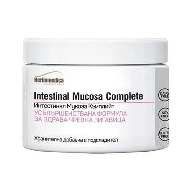 Intestinal Mucosa Complete на Хербамедика съдържа хранителни вещества, които спомагат за здрава чревна лигавица, в това число аминокиселини, минерали, витамини, билки, колаген, желатин и омега 3. Във формулата са включени пре- и пробиотичен комплекс от 10 млрд. живи клетки на 10 микробиални щама. Веднъж попаднали в чревната среда, те бързо се колонизират, регулират цялостната флора, метаболизират ензима бета-глюкоронидаза, който е в основата на балансираната имунна система. Предлага се в опаковка от 90 грама.