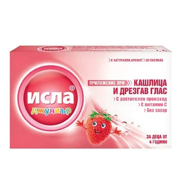 Създадени за облекчаване симптомите на възпалено гърло при децата, с вкус на ягода, пастилите Isla Junior защитават сухата и раздразнена лигавица на устата, гърлото и фаринкса. Съдържат екстракт от Исландски лишей и специален билков екстракт, съдържащ се в пастилите от повече от 80% Муцини. При смучене на пастилите, този концентриран екстракт се разтваря и покрива лигавицата на устата и гърлото като балсам, където оказва своето благотворно и защитно действие. Освен това се стимулира слюноотделянето. Раздразнената лигавица може да се възстанови. Симптомите свързани с настинка и възпалено гърло, като кашлица и дразнене в гърлото (дрезгав глас, пресипналост, затруднено преглъщане и сухота) се облекчават с приема на пастили Исла Джуниър. Предлагат се в опаковка от 20 пастили.