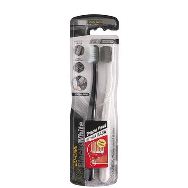 Четките за зъби Блек енд Уайт от Био Кеър са с по-тънка глава от традиционна четка, която достига до труднодостъпните места между зъбите. Функционалните ултра тънки четки са с вградени частици сребро и въглен и силното антибактериално действие, което продължава, дори когато четката не се използва. Ергономичната дръжка осигурява удобен и стабилен захват. С иновативен дизайн за повдигане на главата на четката, когато не се използва, за по-добра хигиена. Предлагат се в комплект от 2 броя четки в бял и черен цвят.