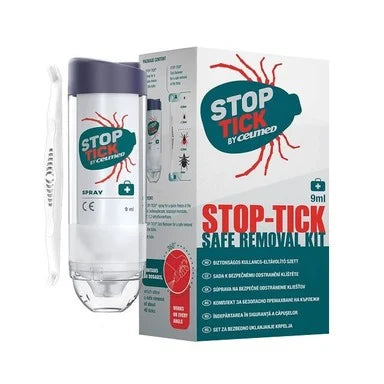 Стоп Тик е медицинско устройство предназначено за отстраняване на кърлежи. Приложимо при хора и животни. Употребява се за намаляване на риска от предаване на болестите, които кърлежите пренасят (енцефалит, лаймска болест, бабезиоза, анаплазмоза и др.). Технологията действа като стопира физиологичните функции на кърлежите и замразява зоната за третиране, като по този начин осигурява локална анестезия. Разработена да покрие цялото тяло на кърлежа, с което да предпази от разкъсване и минимизиране на риска по време на процедурата. Съдържа приблизително 60 дози за отстраняване на до 40 кърлежа. Без инсектициди. Опаковката включва: спрей 9 мл, изделие за отстраняване, епруветка и инструкция.