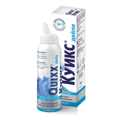 Куикс дейли аерозолен спрей за носни промивки, подходящ за възрастни и деца над 3 години. Втечнява секрета и спомага за неговото отделяне, с което облекчава локалните симптоми на дразнение. Куикс дейли овлажнява и пречиства лигавицата на носа. Отстранява вредните бактерии, вируси, полени, прахови частици и други дразнители. Съдържа 0,9% натурална морска вода богата на ценни минерали и микроелементи. Продуктът е без мирис, с bag-on-valve технология, която го запазва стерилен. Подходящ за приложение при синузити, запушен нос, сенна хрема, алергии. Предлага се в опаковка от 100 мл.