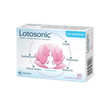 Комбиниран растителен продукт с благоприятно действие при повишена възбудимост, която може да бъде съпроводена с тревожност, безпокойство, стрес и безсъние. Спомага за подобряване качеството на съня и работоспособността. Оказва благоприятно въздействие върху съпътстващи метаболитни, храносмилателни, сърдечно-съдови и неврологични състояния. Lotosonic от Дансон е подходящ за хора, изложени на повишено психическо натоварване, също и при паник атаки. Предлага се в опаковка от 10 таблетки.