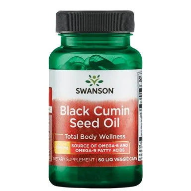 Black Cumin seed oil на Суонсън съдържа ценни за здравето мастни киселини, като с най-високи концентрации в него са омега-6 линоловата киселина и олеиновата киселина (омега-9). Линоловата киселина (омега-6) насърчава здравето на сърцето, регулира кръвното налягане и подобрява чувствителността към инсулина. Олеиновата киселина (омега-9) намалява нивата на триглицеридите и лошия холестерол, с което също подкрепя здравето на сърдечно-съдовата система. Маслото от семената на черния кимион притежават силно антиканцерогенно, противовъзпалително и антибактериално действие и могат да ограничат различни възпалителни и инфекциозни заболявания в организма, причинени от бактерии, гъбички, паразити и вируси. Природният продукт действа благоприятно върху здравето на мозъка и на дихателната система, особено при страдащите от астма. Може да се прилага профилактично за здравето на цялото тяло. Предлага се в опаковка от 60 капсула.