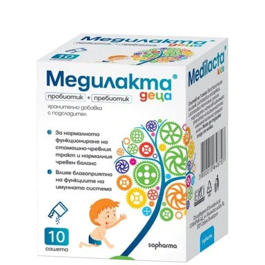 Medilacta за деца от Софарма e синбиотик с подсладител - комбинация от пробиотик и пребиотик, предназначен за регулиране на чревната микрофлора. Продуктът благоприятства здравето на стомашно-чревния тракт и спомага за усвояването на хранителните вещества. Има положителен ефект при храносмилателни нарушения и подпомага функцията на имунната система. Предлага се в удобна опаковка от 10 сашета.