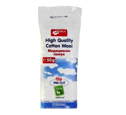 Висококачествен памук за козметични и медицински цели на марката Медика. Силно абсорбиращ, не съдържа алкални и киселинни примеси. Памукът е избелен с реагенти, несъдържащи хлор или оптически избелители. Медицинският памук Medica в опаковка от 50 g е перфориран, специално разработен за икономична употреба.