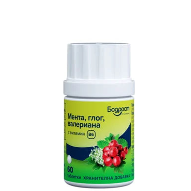 Мента, глог, валериана с витамин B6 от Bodrost Софарма има благоприятен ефект върху функционирането на сърдечно-съдовата, нервната и храносмилателната система. Помага при стрес, умора, тревожност и безсъние. Валерианата в състава успокоява и понижава нивото на артериалното кръвно налягане, като в същото време помага при сърцебиене и психическа умора. Глогът стимулира артериалното кръвообращение и влияе благоприятно на мозъчните и периферните кръвоносни съдове, а ментата стимулира сърдечната дейност. Витамин B6 допринася за повишаването на тонуса, правилната когнитивна функция и насърчава производството на серотонин (хормонът на щастието), от който пряко зависят и нивата на мелатонин (хормонът на съня) в организма. Комбинацията от мента, глог, валериана с витамин B6 оказва благоприятно влияние върху целия организъм. Предлага се в опаковка от 60 таблетки.