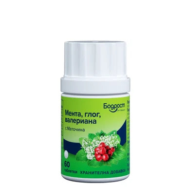 Мента, глог, валериана с маточина на Bodrost Софарма благоприятства състоянието на нервната и сърдечно-съдовата система. Подпомага храносмилателната система и намаляването на стреса, тревожността и безсънието. Валерианата в състава успокоява и понижава нивото на артериалното кръвно налягане, като в същото време помага при сърцебиене и психическа умора. Глогът стимулира артериалното кръвообращение и влияе благоприятно на мозъчните и периферните кръвоносни съдове, а ментата стимулира сърдечната дейност. Маточината действа успокояващо на нервната система и подобрява когнитивните способности, включително паметта и вниманието. Комбинацията от мента, глог, валериана и маточина оказва благоприятно влияние върху целия организъм. Предлага се в опаковка от 60 таблетки.