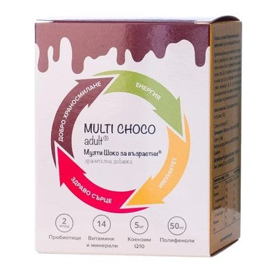 Multi Choco на Натурфарма са мултивитамини с пробиотик под формата на шоколадови блокчета за възрастни. Комбинацията от съставки осигурява добро храносмилане, здраво сърце, енергия и имунитет. Добавеният Витамин D поддържа нормалните имунни функции. Намалява чувството на умора и отпадналост и благоприятства нормалната работа на сърцето и сърдечните функции, подпомага психичната дейност. Възстановява чревната флора с бифидобактерии от патентования пробиотик HOWARU. С приятен вкус на тъмен шоколад. Предлага се в опаковка 20 шоколадови блокчета.