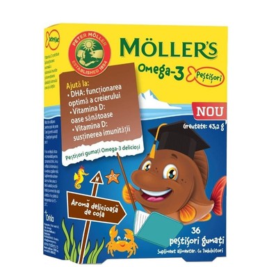 Mollers Omega-3 Желираните риби осигуряват необходимата дневна доза омега 3 мастни киселини и витамин D, които допринасят за нормалната функция на мозъка и имунната система. Продуктът е с приятен вкус на кола и е подходящ за деца над 3 години. Съдържа естествени есенциални мастни Omega-3 киселини (DHA и EPA) и витамин D. EPA и DHA допринасят за нормалната сърдечна и мозъчна функция, както и за нормално зрение. Витамин D спомага за оптималното абсорбиране/използване на калция и фосфора, както и за поддържане здравето на костната система и зъбите. Предлага се в опаковка от 36 желирани риби.