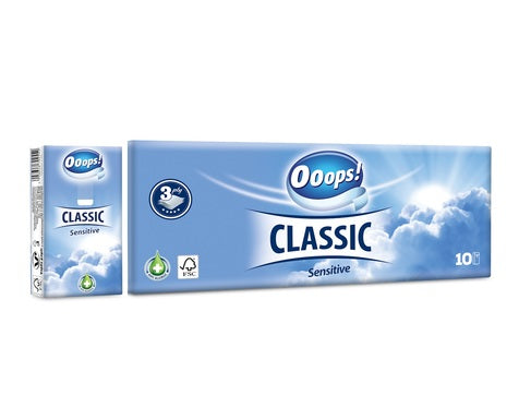 Трипластови леки и комфортни сухи кърпички Ooops Classic Sensitive, подходящи за еднократна употреба по време на път, в динамичното ежедневие, в офиса и когато е необходимо. Носните кърпички Ооопс се предлагат в стек от 10 пакета x10 броя кърпички.