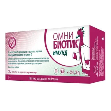 Omni Biotic Immund съдържаща комбинация от бактериалния щам Streptоcoccus salivarius K12, който естествено се среща в устната кухина и витамин D, допринасящ за нормалната функция на имунната система при деца и възрастни. С приятен вкус на ягода. Продукт, подходящ за вегетарианци. Не съдържа глутен, захар и лактоза. Предлага се в опаковка от 30 таблетки за смучене.