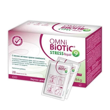 Създаден със специфична комбинация от 9 бактериални щамове, Омни Биотик Стрес Рипеър е продукт, който се справя с възпалението на чревната лигавица, възникнало вследствие на продължителен стрес. Освен това Omni Biotic Stress Repair има способността да подобрява паметта, взимането на решения и поведението. Допълнителният прием на точно определени пробиотични бактерии спомага за неутрализиране на патогенните микроорганизми и засилване на защитните сили на организма. Предлага се в опаковка от 28 сашета, всяко от което х3 г.