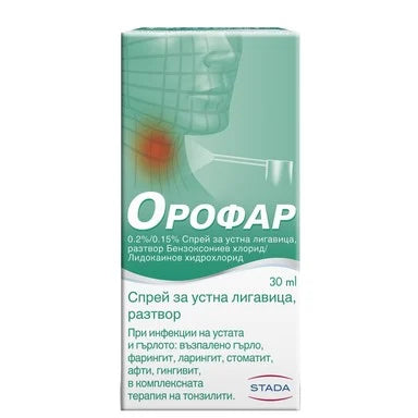 Орофар Спрей от Стада за устна лигавица е лекарствено средство, което се прилага за облекчаване на болки в гърлото при простуда, фарингити и ларингити (със или без затруднено гълтане), инфекции в устата и улцерации на устната лигавица (афти). Orofar на фармацевтичната компания Stada действа срещу бактериите, вирусите и гъбичките, които причиняват възпалителни процеси в устата и гърлото. Местният анестетик лидокаин облекчава възпаленото гърло и болката при преглъщане, предизвикани от възпалението. Предлага се в опаковка от 30 мл.