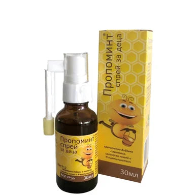 Орален спрей Propomint, допринася за нормалната дейност на горните дихателни пътища при децата. Спомага за намаляване на дразненето в устната кухина, благоприятства имунната система и здравето на гърлото и венците. Предлага се в опаковка от 30 мл.