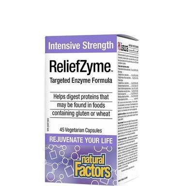 В подкрепа на храносмилането и усвояването на храни, съдържащи глутен, пшеница и млечни продукти, ReliefZyme комбинирана формула от Натурал Факторс. Спомага за редуциране на неприятните симптоми свързани с подуване на корема и газове, от които често страдат хората в резултат от затрудненото храносмилане на протеините глутен и казеин. Ензимите спомагат за разграждането на храната и усвояването на ценни хранителни вещества. Не съдържа: изкуствени оцветители, аромати, консерванти, млечни продукти, захар, пшеница, глутен, соя, яйца, риба, черупчести, животински продукти, сол, ядки или ГМО. Подходящ за вегани/вегетарианци. Предлага се в опаковка от 45 капсули.