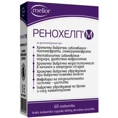 Renohelp M на компанията Дойч е продукт с комплексно действие, който се препоръчва при хронични бъбречни заболявания като пиелонефрити, гломерулонефрити, при метаболитни заболявания (подагра, диабетна нефропатия), при хронична бъбречна недостатъчност( в начален и напреднал стадий) , при хронични бъбречни увреждания, при бъбречно-каменна болест, при инфекции на отделителната система (цистит), както и при бъбречни увреждания по време и след химиотерапия. Ренохелп М е съставен от хранителни вещества, които имат свойството да подпомагат всички бъбречни структури и да спомагат за нормализиране функциите на цялата отделителна система. Комплексът Ренохелп притежава изразено благоприятно физиологично въздействие спрямо намаляването на азотосъдържащите фракции в кръвта (урея, креатинин, пикочна киселина), спрямо нивото на серумните липиди, има лек диуретичен ефект, без това да води до изразени нарушения на водно-солевия баланс с калиев дефицит. Допринася за поддържане на нормалните нива на общия холестерол и триглицеридите. Ренохелп оказва благоприятно физиологично въздействие върху кръвното налягане, което се дължи на диуретичното му действие и блокиране на АСЕ (ангиотензин-конвертиращ ензим). Подходящ е за употреба от хора, предразположени към образуване на камъни в бъбреците. Предлага се в опаковка от 60 таблетки.