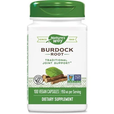 Burdock на марката Нейчърс Уей при нарушение в обмяната на веществата. Има благоприятен ефект върху черния дроб и кожата. Коренът от репей стимулира обмяната на веществата. Притежава силно потогонно действие, а освен това е доказан диуретик. Детоксикира тялото и способства изхвърлянето на ненужните вещества. Повлиява добре кръвоносната и сърдечно-съдовата системи. Подходящ за употреба през есенно-зимния сезон. Поддържа естествените защитни сили на организма. Предлага се в опаковка от 100 капсули.