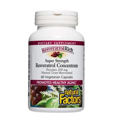 За здравето на сърдечно-съдовата система, Resveratrol Rich супер концентрат от Натурал Факторс. Комбинирана формула, извлечена от люспите на Червено грозде и Японска фалопия за по-бързо действие и усвояване от организма. Ресвератролът е мощен антиоксидант, който оказва подкрепа на организма за защита на клетките от оксидативен стрес. С благоприятно действие при ревматоиден артрит и възпалителни болести на червата. Подкрепя превенцията за болестта на Алцхаймер и други форми на деменция. С ползи при дефицит на вниманието, хиперактивност, депресия, биполярно разстройство и други заболявания. Не съдържа изкуствени оцветители, аромати, консерванти, подсладители, млечни продукти, нишесте, пшеница, скорбяла, захар, дрожди, глутен, яйца, царевица, черупчести, ядки и ГМО. Подходящ за вегани, вегетарианци. Предлага се в опаковка от 60 капсули.