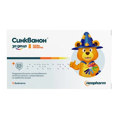 Пробиотикът Синкванон за деца от Неофарм поддържа баланса, естествената многочисленост и разнообразие на чревната флора при деца над 1 година. Той представлява специална селекция от 13 пробиотични щама – лактобацили, бифидобактерии и сахаромици, с висока естествена издръжливост , в дневна доза от 15 милиарда живи клетки, която поддържа нормалната чревна микрофлора. Включва също Saccharomyces boulardii – пробиотична дрожда, която не се повлиява от антибиотиците. Произвежда ензими, които разграждат токсините в червата и допринася за поддържането на нормалната чревна микрофлора. Наличието на разнообразни щамове в Синкванон за деца благоприятства взаимното усилване на полезните им ефекти. Щамовете в продукта са бързоделящи се, като удвояват масата си приблизително на всеки 20 минути. Благодарение на това те успяват да поддържат чревната микрофлора по-близо до физиологичните нива. Предлага се в опаковка от 10 шоко мечета.