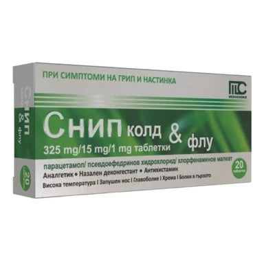 Snip Cold and Flu на Медохеми е комбиниран продукт, предназначен за облекчение на симптомите на грип и простудни заболявания като кашлица, запушен нос, ринит, кихане, температура или лека до силна болка от различен произход. Съдържа парацетамол, хлорфенамин и псевдоефедрин. Парацетамол има аналгетично (обезболяващо) и антипиретично (намаляващо температурата) действие. Псевдоефедрин намалява отока на лигавиците на горните дихателни пътища и помага да дишате по-лесно. Хлорфенамин е антихистамин, използван за облекчение на алергичните симптоми на дихателните пътища, като хрема, оток на носната лигавица, зачервяване и/ или свръхчувствителност на очите. Предлага се в опаковка от 20 таблетки.