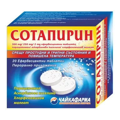 Sotapiryn от Chaykapharma е лекарствен продукт без лекарско предписание, който е предназначен за облекчаване на симптомите при простуда и грип. Сотапирин притежава аналгетичен и антипиретичен ефект. Предлага се в опаковка от 20 ефервесцентни таблетки.