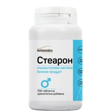 Stearon от Хербамедика е натурален продукт, чийто състав влияе върху производството на тестостерон, с което повишава потентността и поддържа хормоналната активност. Той има изразен противовъзпалителен ефект върху простатната жлеза. Спомага за нормалното уриниране. Подобрява кръвообращението в гениталиите, с което влияе ползотворно върху еректилността. Предлага се в опаковка от 100 таблетки.