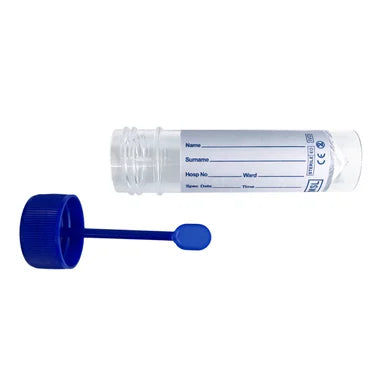 Стерилен контейнер за проби от фекалии. Контейнерът е индивидуално опакован, като има лъжичка и място за надписване на имената, датата и номера на пробата на пациента. Вместимост 30 мл. Предлага се в опаковка от 1 брой.