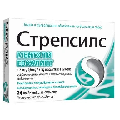 Strepsils с ментол и евкалипт на Рекит Бенкисер Хелткеър е лекарствено средство, което принадлежи към група лекарствени продукти наричани антисептици и се препоръчва за лечение и облекчаване на симптомите при инфекциозно-възпалителни заболявания на устната кухина (стоматити, фарингити, ларингити), придружени от назална конгестия. Също така Strepsils Ментол и Евкалипт притежава антибактериални, противогъбични и антивирусни свойства и помага при запушен нос. Ефектът се проявява в първите 5 минути и продължава до 2 часа след приложението на лекарствения продукт. Отпушва носа. Предлага се в опаковка от 24 таблетки.