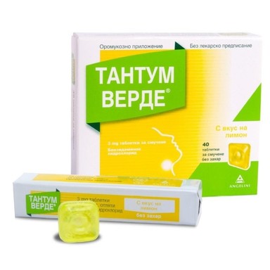 Таблетки за смучене без захар на марката Ангелини фарма. Tantum verde е лекарствен продукт без лекарско предписание, който се препоръчва при настинка и грип, възпалено гърло и болки в устната кухина. Продуктът е с максимално бърз ефект, който започва да действа още на първата минута и има мощно продължително аналгетично действие до 90 минути. Таблетките за смучене се прилагат при болезнени възпаления в устната кухина и гърлото, възпаления на венците, на сливиците, възпаления на лигавицата на гърлото и на ларинкса. Особено подходящи са за намаляване на оплакванията при простудни заболявания. Продуктът съдържа активното вещество бензидаминов хидрохлорид, който притежава изразени противовъзпалителни и болкоуспокояващи свойства. Въз основа на бързото проникване и локалното натрупване във възпалената тъкан се стига до бързо затихване на симптомите. Таблетките са с добра локална поносимост, което води до целенасочена терапия на възпалителните симптоми и на оплакванията при поглъщане. Предлагат се в опаковка от 40 таблетки.