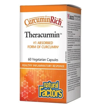 Theracurmin на Натурал Факторс е иновативен продукт в производството на куркуминовите екстракти. Формулата CurcuminRich Theracurmin засилва лечебните свойства на куркумина, който представлява жълти пигмент в състава на куркумата. С висока бионаличност. Не съдържа глутен, пшеница, млечни продукти, яйца, захар, соя, фъстъци, риба, миди, животински продукти, сол, изкуствени аромати, консерванти или ГМО. Предлага се в опаковка от 60 капсули.